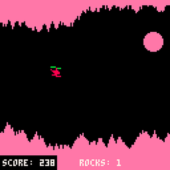 Inspired by the old Helicopter browser game, and made in the Pico-8 fantasy console. I developed this as a learning exercise for Pico-8. The code that generates the cave walls was slightly modified from a tutorial in the "Gamedev with Pico-8" zine.